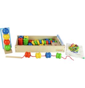 - Zestaw zawiera drewniane pudełeczko, komplet kolorowych koralików oraz sznurki do sznurowania.