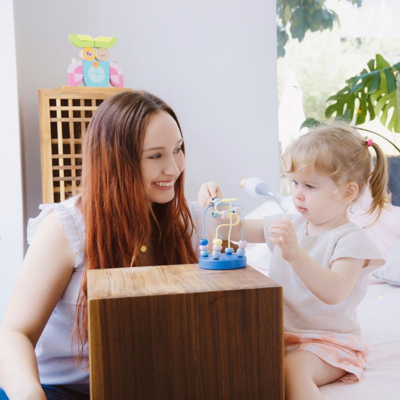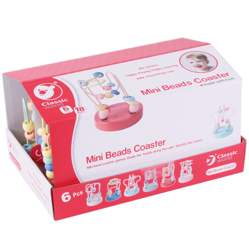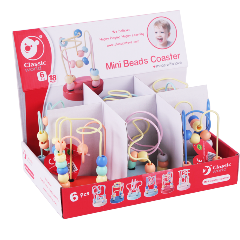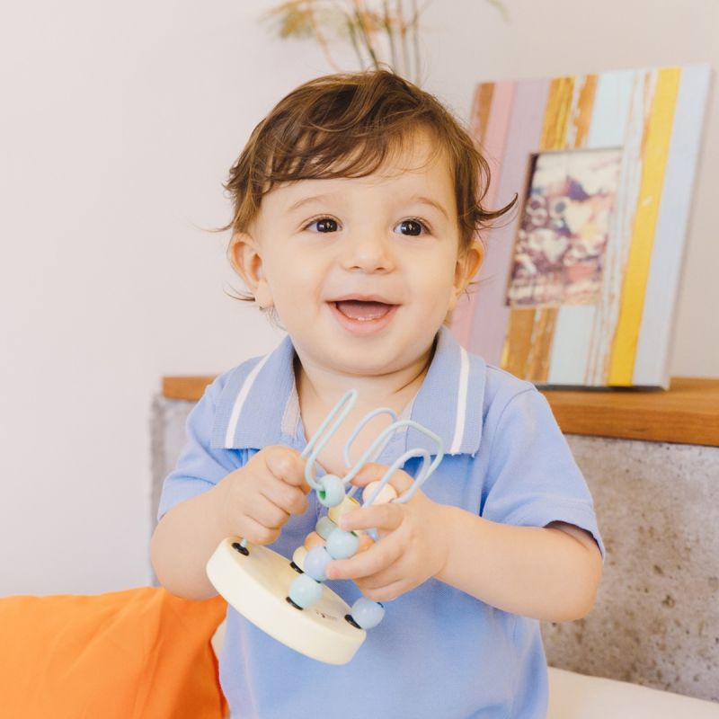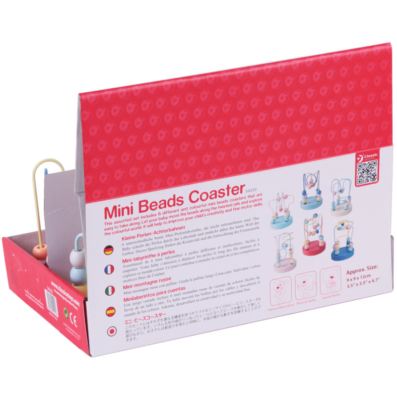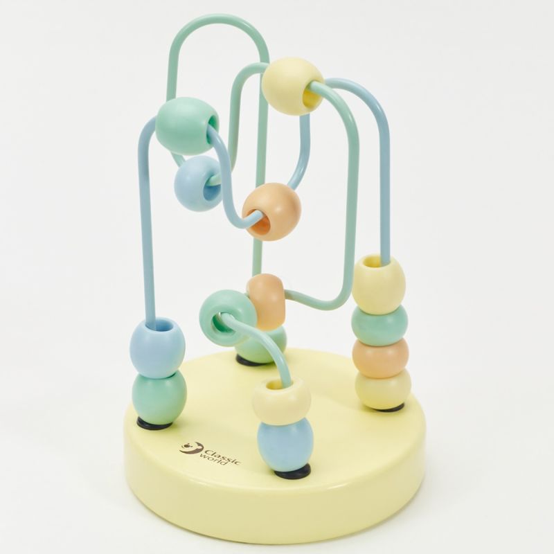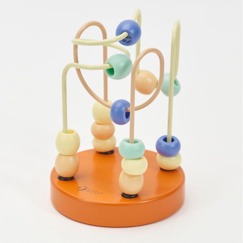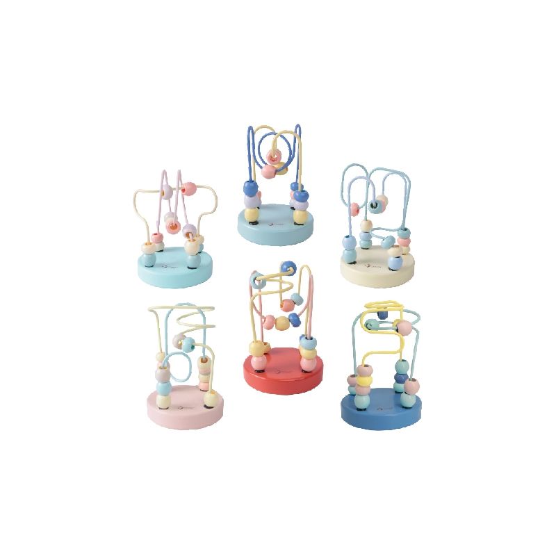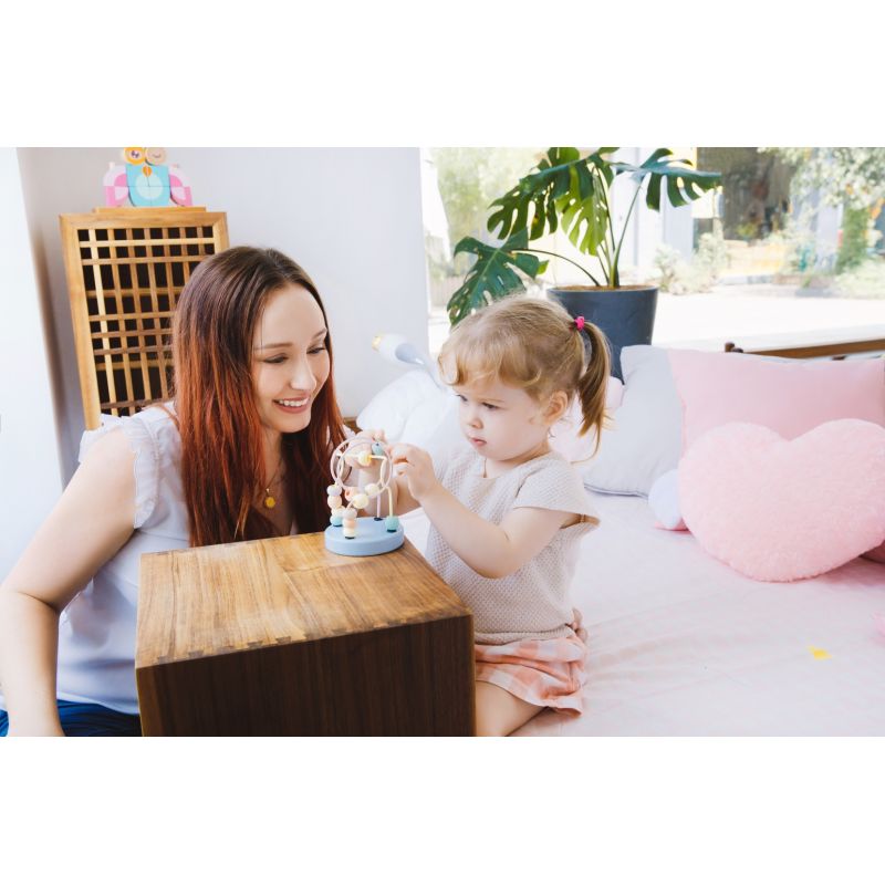 Zabawka posiada dwie metalowe pętle o różnym stopniu trudności, na których znajdują się drewniane koraliki do przesuwania. Dziecko, prowadząc koraliki po zakrzywionych prętach, uczy się kontroli nad ruchami i doskonali koordynację ręka-oko. Dzięki kolorowym elementom i motywom wiosennym, pętla przyciąga wzrok i zachęca do wielokrotnego korzystania. Brak ostrych krawędzi oraz wykonanie z ekologicznych, naturalnych materiałów zapewnia pełne bezpieczeństwo podczas zabawy.