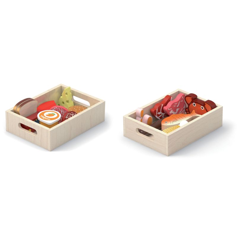 VIGA Drewniany Zestaw Artykułów Spożywczych w Skrzynkach Śniadanie Ryby Mięso Nabiał