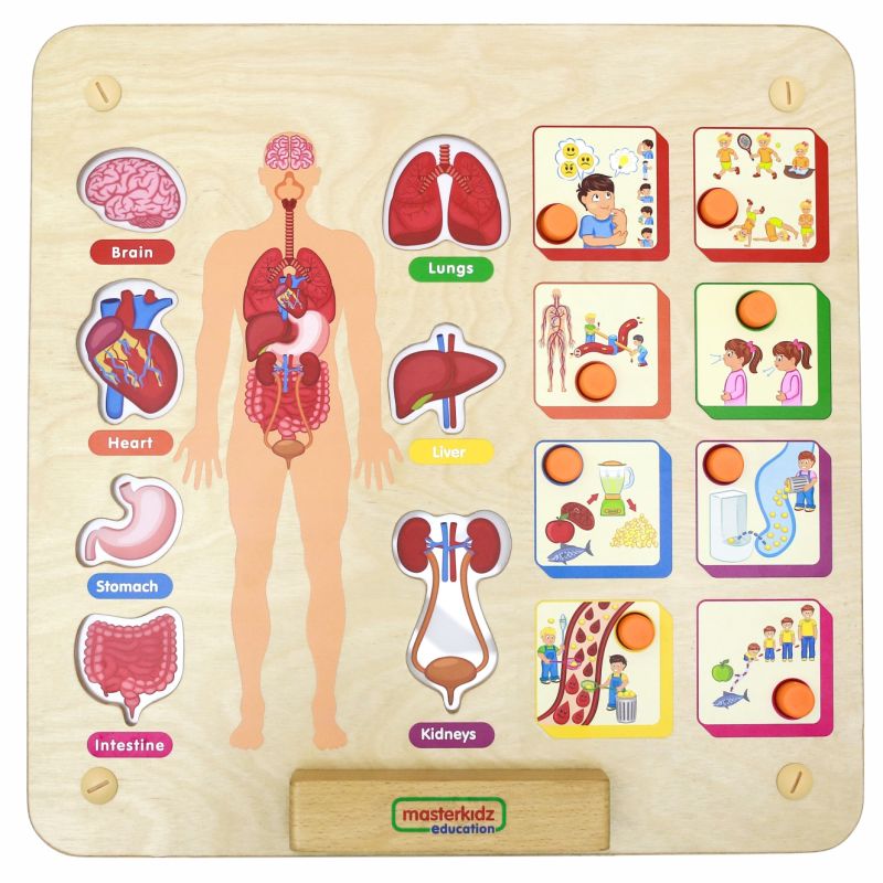 Ta tablica pozwala młodym odkrywcom poznać najważniejsze układy i narządy ludzkiego ciała. Dzieci uczą się lokalizacji, wyglądu i funkcji mózgu, serca, płuc, nerek, żołądka, wątroby i jelit. W prosty i przystępny sposób przedstawia działanie tych organów – od myślenia i oddechu, aż po trawienie.