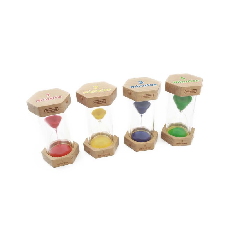 Zestaw 4 kolorowych klepsydr odmierzających różne odcinki czasu. Idealny do nauki upływu czasu, jednostek jego pomiaru oraz wykonywania zadań na czas. Połączenie zabawy i skutecznej edukacji.
