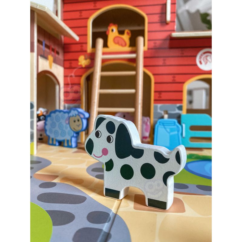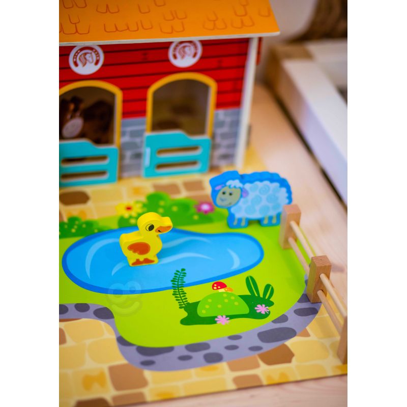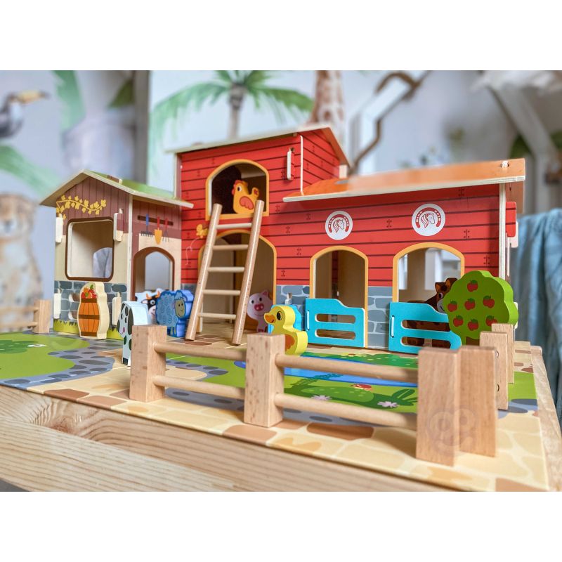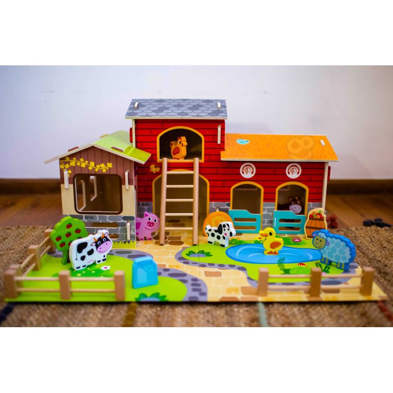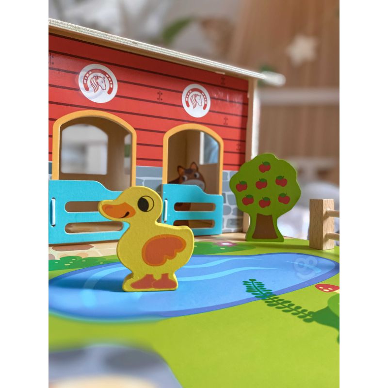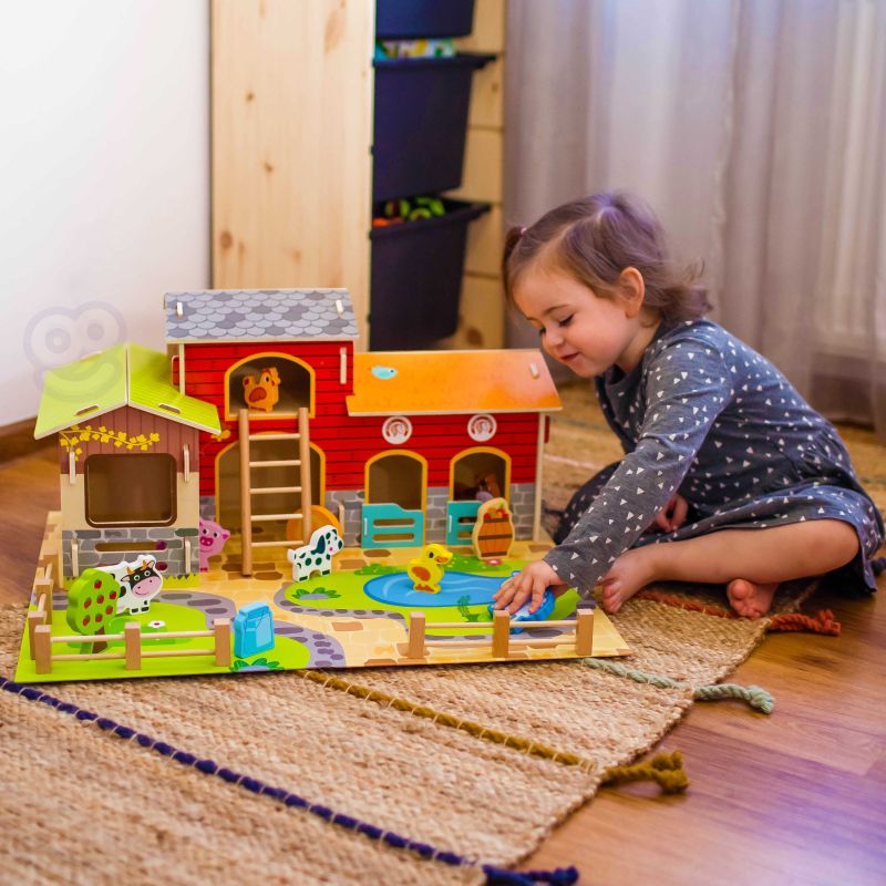 Zestaw zawiera wszystko, co potrzebne do zbudowania tętniącego życiem gospodarstwa. W jego skład wchodzą budynki takie jak obora, kurnik i stajnia, a także plac z oczkiem wodnym. Farmę zamieszkują figurki uroczych zwierząt: konia, kury, świnki, owcy, pieska i kaczki. Dzięki tej zabawce dziecko rozwija wyobraźnię, tworząc własne scenariusze, a także doskonali sprawność manualną i koordynację ręka-oko podczas aranżowania przestrzeni i zabawy figurkami.