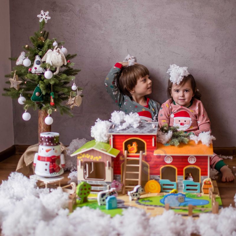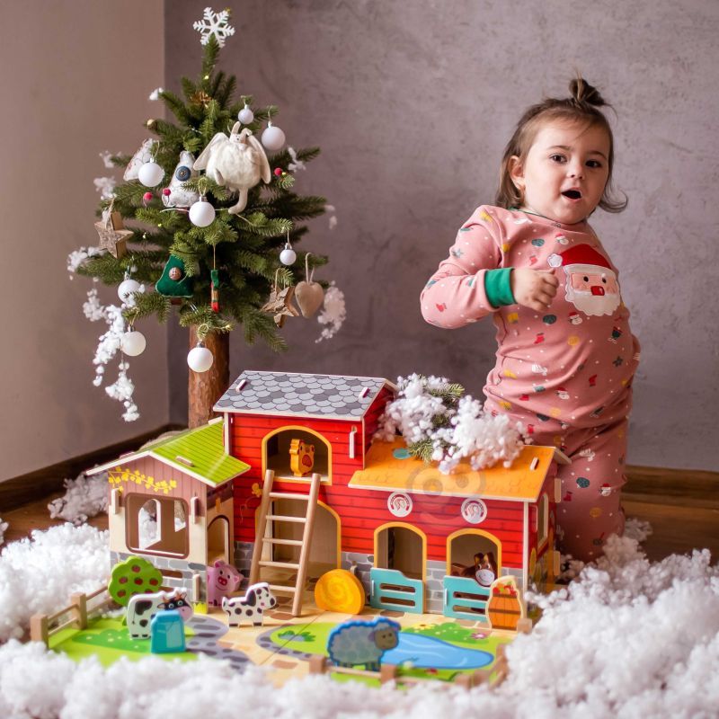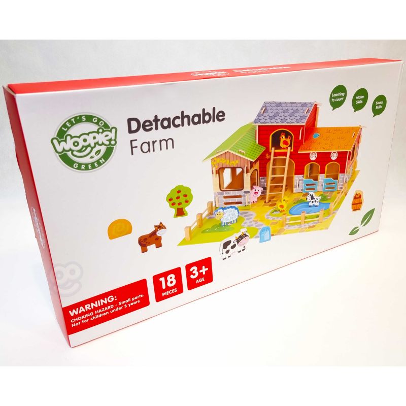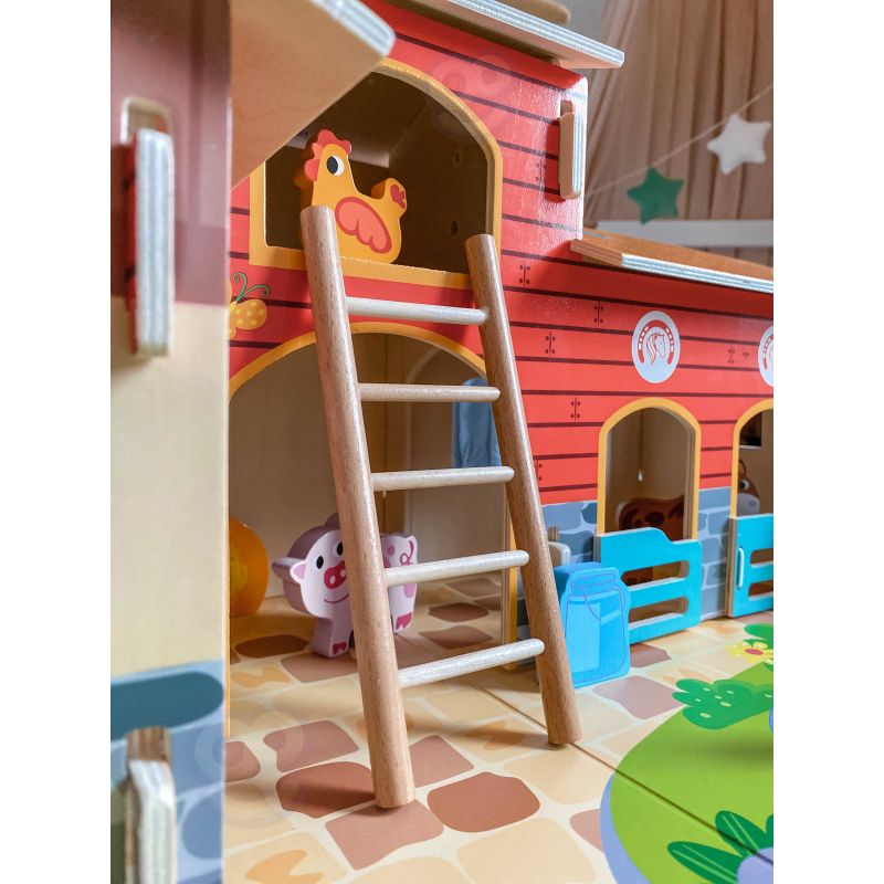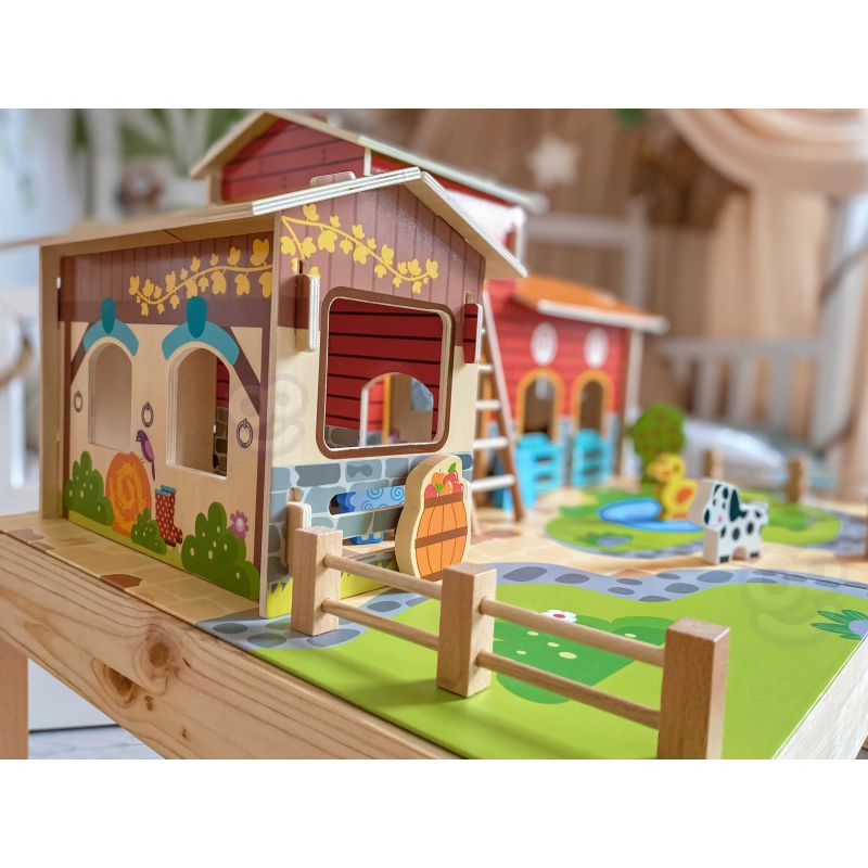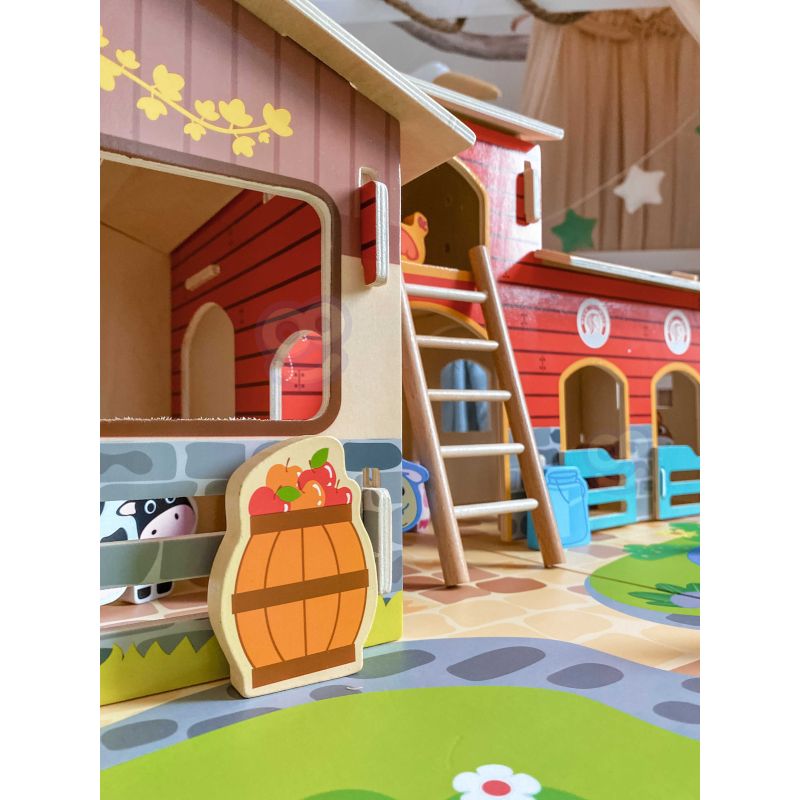 Zestaw zawiera wszystko, co potrzebne do zbudowania tętniącego życiem gospodarstwa. W jego skład wchodzą budynki takie jak obora, kurnik i stajnia, a także plac z oczkiem wodnym. Farmę zamieszkują figurki uroczych zwierząt: konia, kury, świnki, owcy, pieska i kaczki. Dzięki tej zabawce dziecko rozwija wyobraźnię, tworząc własne scenariusze, a także doskonali sprawność manualną i koordynację ręka-oko podczas aranżowania przestrzeni i zabawy figurkami.