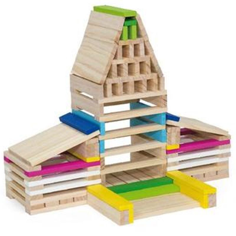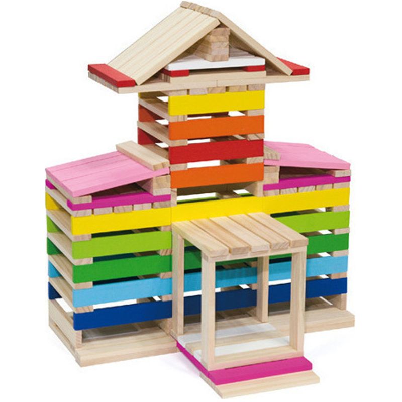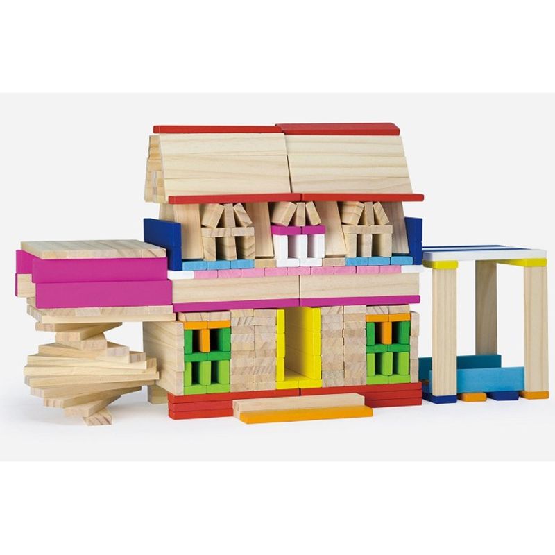 - 250 drewnianych klocków w różnych kształtach i kolorach