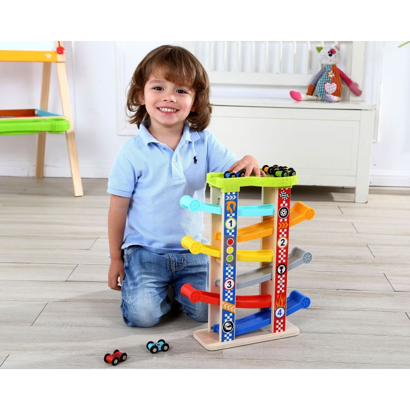 Drewniana zjeżdżalnia dla samochodzików TOOKY TOY to bezpieczna i edukacyjna zabawka rozwijająca motorykę, wyobraźnię i logiczne myślenie malucha.