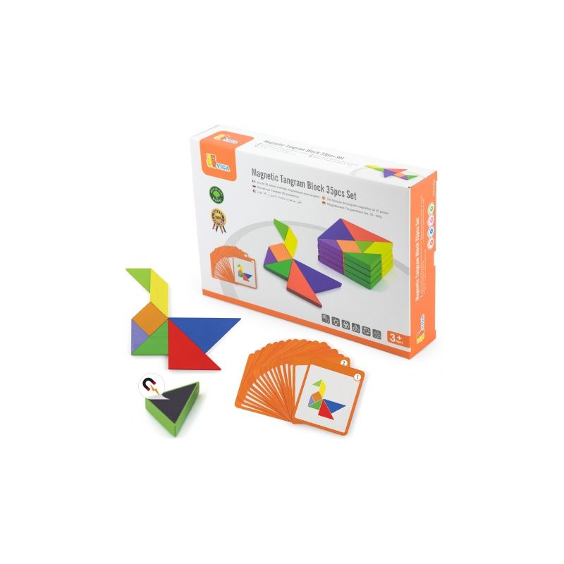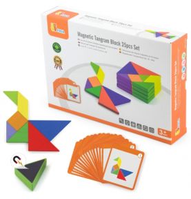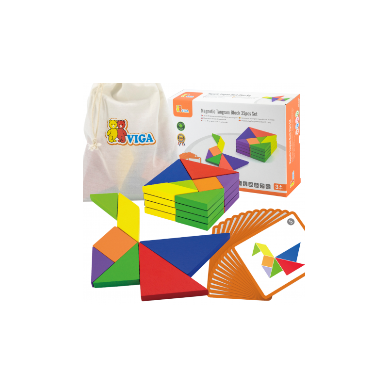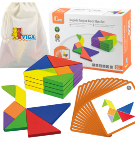 Puzzle tangram od Viga Toys to doskonała zabawka dla małych miłośników gier logicznych i kreatywnych. Dziecko może układać obrazki według dołączonych kart lub tworzyć własne wzory, rozwijając wyobraźnię, koncentrację i umiejętność logicznego myślenia zgodnie z metodą Montessori.