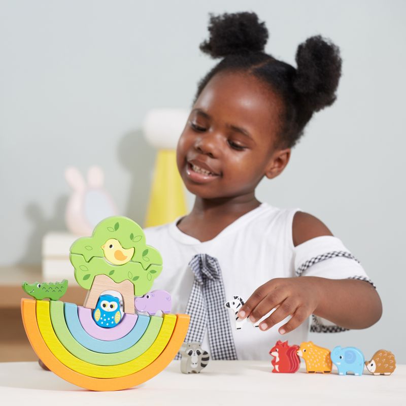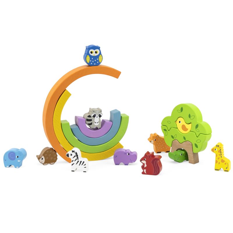 Drewniana Tęcza Viga Toys to klasyczna zabawka inspirowana metodą Montessori, która rozwija kreatywność, logiczne myślenie i zdolności manualne dziecka poprzez swobodną zabawę. Zestaw składa się z 5 kolorowych łuków, 11 uroczych zwierzątek oraz 3 drewnianych klocków, z których można stworzyć drzewko.