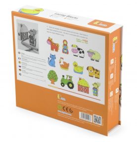 • Klocki przedstawiają: krówki, kaczuszki, kotka, kurki, pieska, konika, owieczkę, farmera i jego żonę, traktor, stodołę, jabłoń