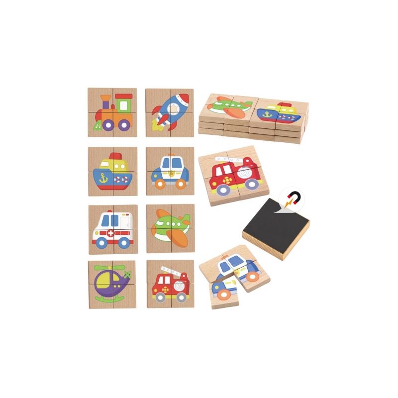 Magnetyczna układanka w formie drewnianych klocków to idealna zabawka dla dzieci, które uwielbiają odkrywać świat i ćwiczyć logiczne myślenie. Zestaw pozwala ułożyć aż 8 różnych obrazków przedstawiających pojazdy – każdy z nich składa się z 4 magnetycznych elementów. Klocki można mocować do tablicy, tworząc pełne ilustracje lub inspirując dziecko do rysowania własnych wersji pojazdów.