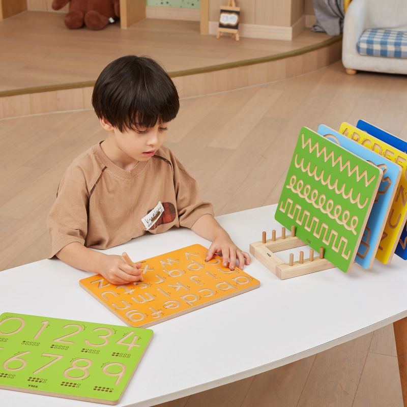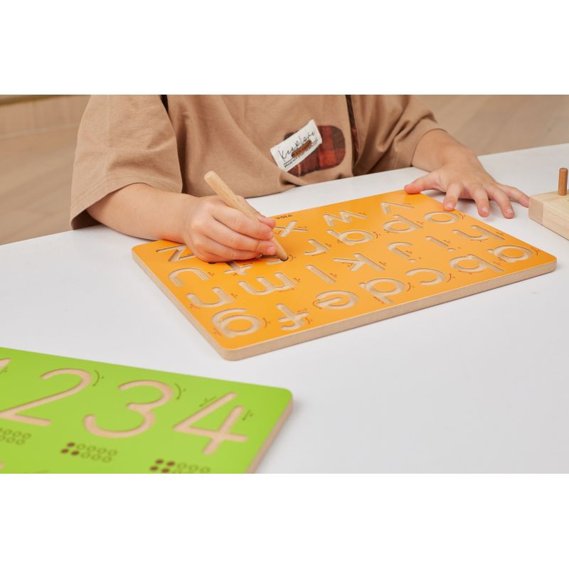 Tablica kreślarska od marki VIGA to idealna zabawka dla dzieci do trenowania rączki przed nauką pisania. Delikatnie wygrawerowane i zakrzywione rowki pomagają kontrolować ruch dłoni, kształtując pamięć mięśniową poprzez wielokrotne śledzenie liter. Każda litera oznaczona jest strzałkami, co wspiera naukę prawidłowej kolejności pisania. Dzięki kompaktowym rozmiarom tablica jest wygodna do użycia na stole lub biurku.