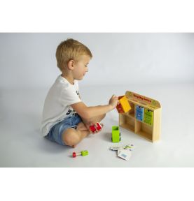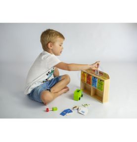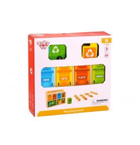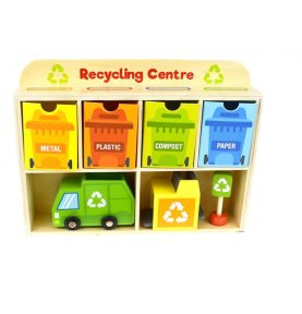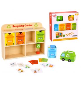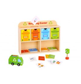 Zróbmy co w naszej mocy, aby ocalić nasza planetę! Warto od najmłodszych lat uczyć dzieci dobrych nawyków, dlatego odkryj świat sortowania śmieci z Centrum Recyklingu od marki Tooky Toy. Zabawa polega na sortowaniu śmieci, za pomocą kart, na których narysowane są odpady wykonane z różnych materiałów. Kartę z obrazkiem wrzucamy do śmieciarki, następnie do maszyny sortującej i na końcu do odpowiedniego kontenera umieszczonego na specjalnej, drewnianej szafce, według tego z jakiego materiału przedmiot na obrazku jest wykonany.