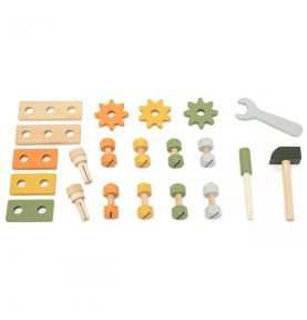 - Zawiera 21 elementów: młotek, klucz, śrubokręt, 4 pary śrub i nakrętek, 2 kołeczki, 3 koła zębate oraz 5 deseczek z otworami