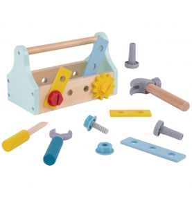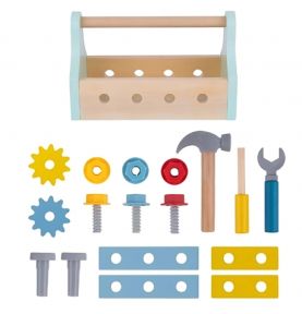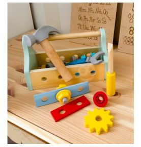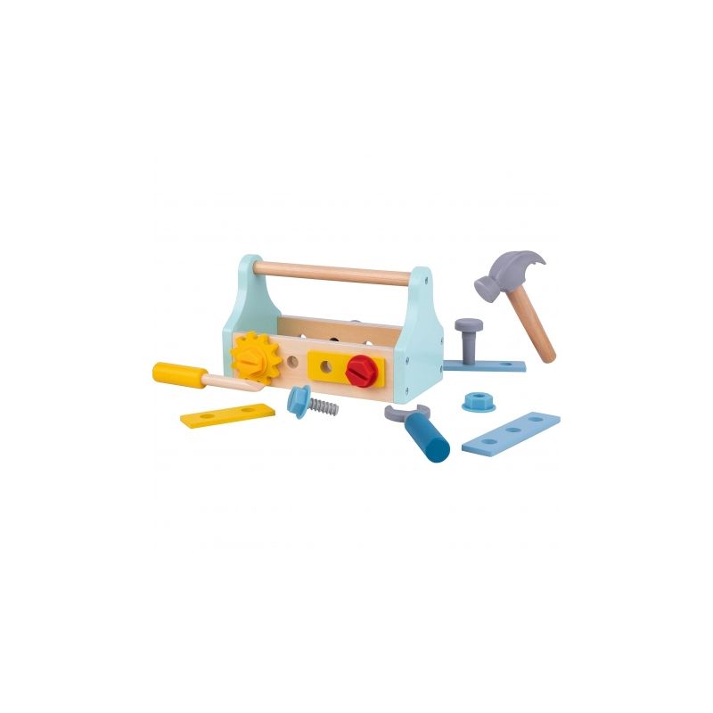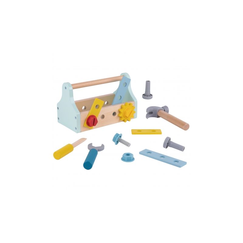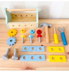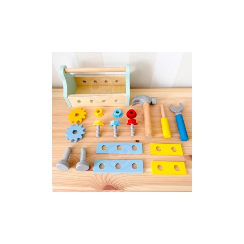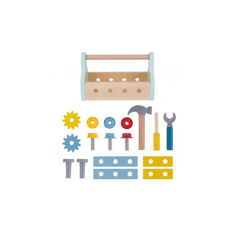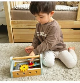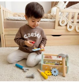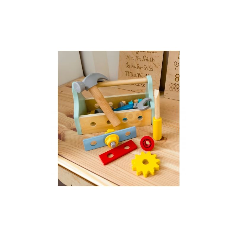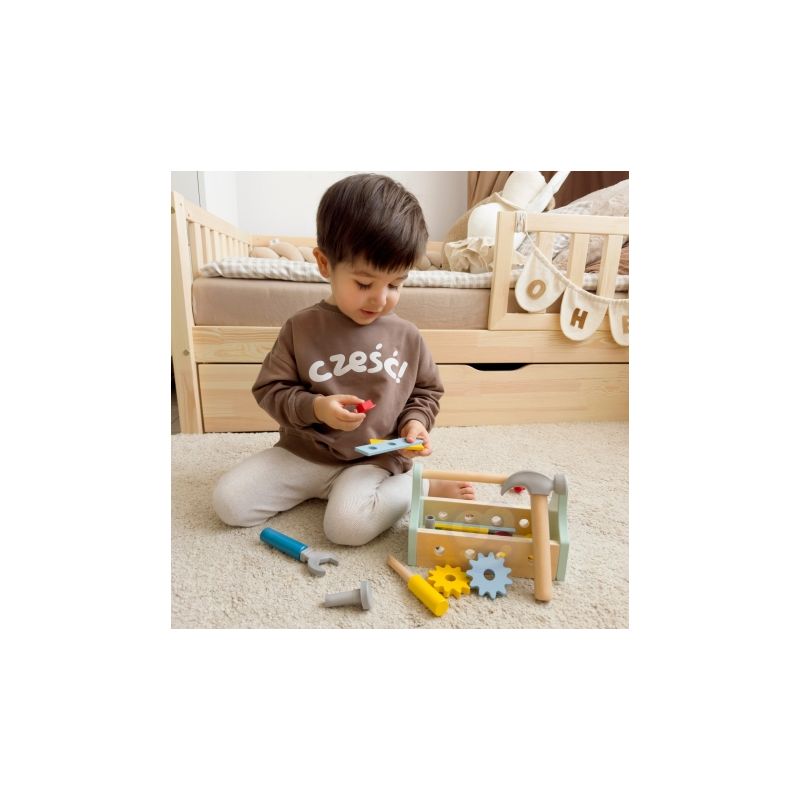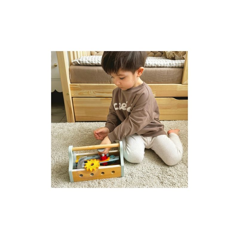 Drewniana skrzynka z narzędziami dla dzieci od 3 roku życia. Zestaw rozwija wyobraźnię, kreatywność, logikę oraz motorykę, pozwalając maluchom bawić się w budowanie i naprawianie.