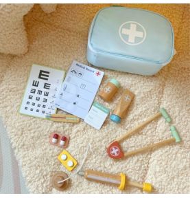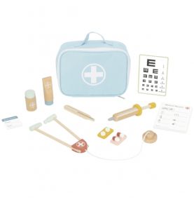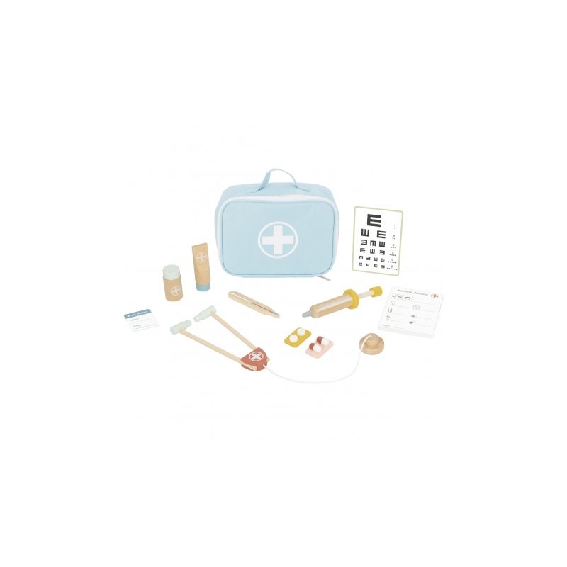 • 11 elementów: stetoskop, strzykawka, termometr, lekarstwa, tubka maści, buteleczka, plik kart medycznych, karta do badania wzroku, plakietka imienna