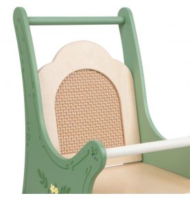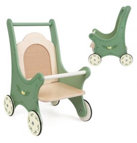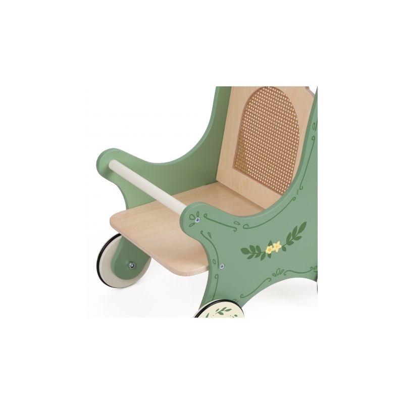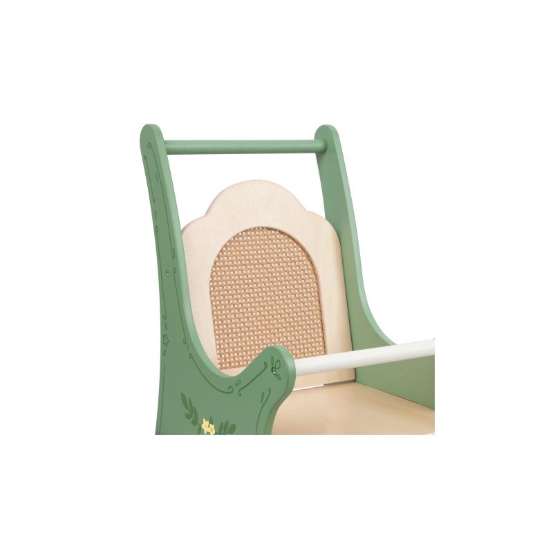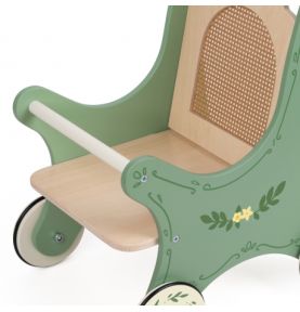 Ten uroczy wózek dla lalek łączy klasyczny styl z naturalnymi materiałami. Zielona konstrukcja z kwiatowymi zdobieniami i rattanowym oparciem przyciąga uwagę i tworzy niepowtarzalny klimat retro. Idealny dla dzieci, które lubią odgrywać role i opiekować się swoimi lalkami i pluszakami.