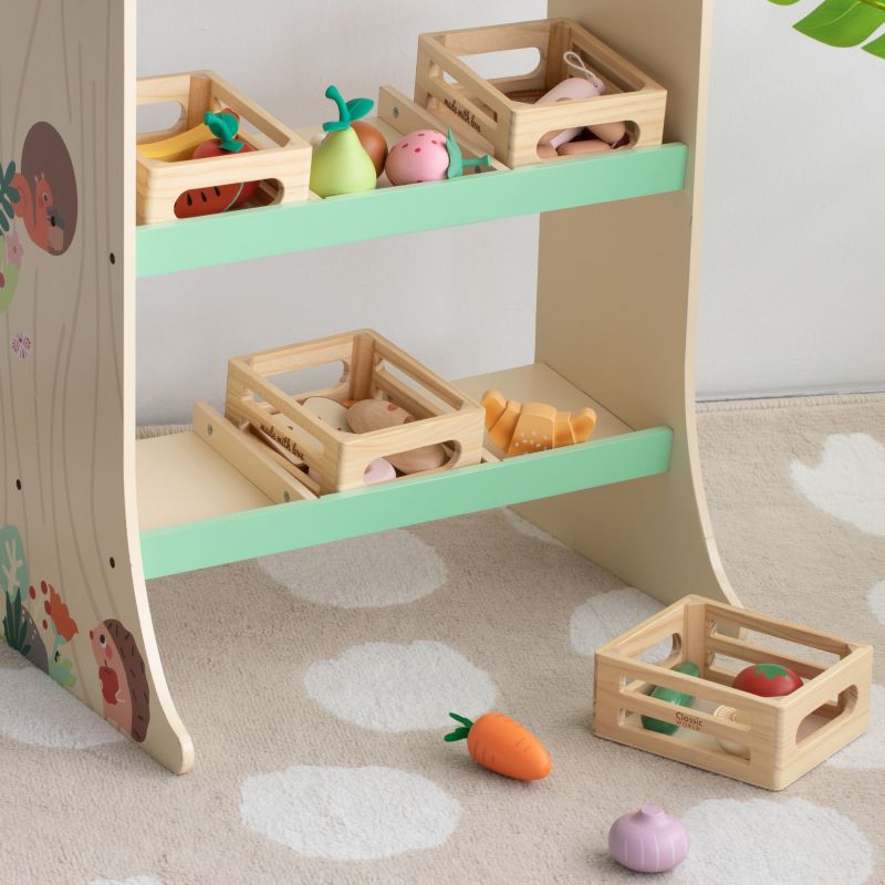 Drewniany koszyk z kolorowymi owocami, idealny do zabawy w kuchnię lub sklep. Rozwija wyobraźnię, kreatywność i umiejętności społeczne dzieci od 18 miesiąca życia.