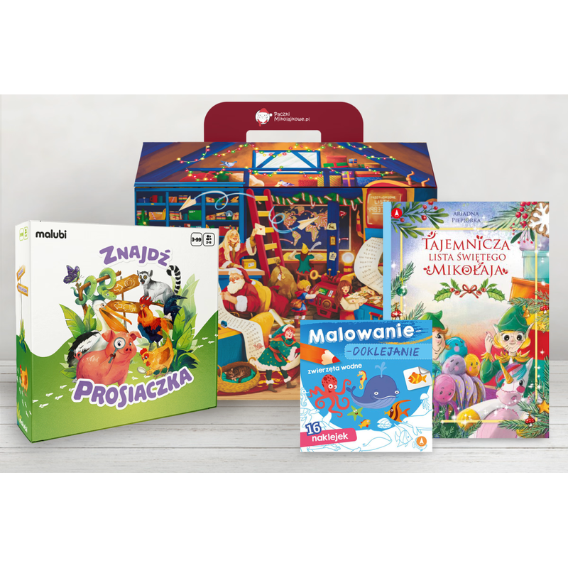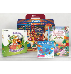 Paczka zawiera grę edukacyjną, która w ciekawy sposób pomaga maluszkowi poznawać świat zwierzątek, uczyć się ich rozróżniania i klasyfikowania. W zestawie znajduje się także urocza bajeczka świąteczna, umilająca wspólny czas z rodzicami i wspierająca budowanie nawyku wspólnego czytania, a także książeczka z pomysłowymi zadaniami, rozwijająca twórcze myślenie i zachęcająca do aktywnej zabawy.
