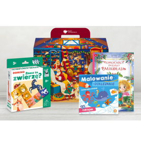 Paczka zawiera grę edukacyjną, która pozwala maluszkom poznawać świat zwierząt, ćwiczyć ich rozpoznawanie i klasyfikowanie, a przy tym wspiera rozwój pamięci i koncentracji. W zestawie znajduje się także urocza bajeczka świąteczna, umilająca wspólny czas z rodzicami i pomagająca budować nawyk wspólnego czytania oraz książeczka pełna pomysłowych zadań, rozwijających twórcze myślenie i zachęcających do aktywnej zabawy.