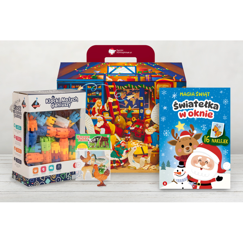 Paczka składa się z zestawu klocków konstrukcyjnych–korony, które gwarantują świetną zabawę, a jednocześnie rozwijają wyobraźnię i wspierają ćwiczenie koordynacji ręka–oko. W zestawie znajdują się także figurki zwierząt domowych, pomagające rozwijać wyobraźnię i umiejętności narracyjne dziecka. Całość uzupełniają świąteczne ćwiczenia z naklejkami, wspierające koncentrację i dalszy rozwój.