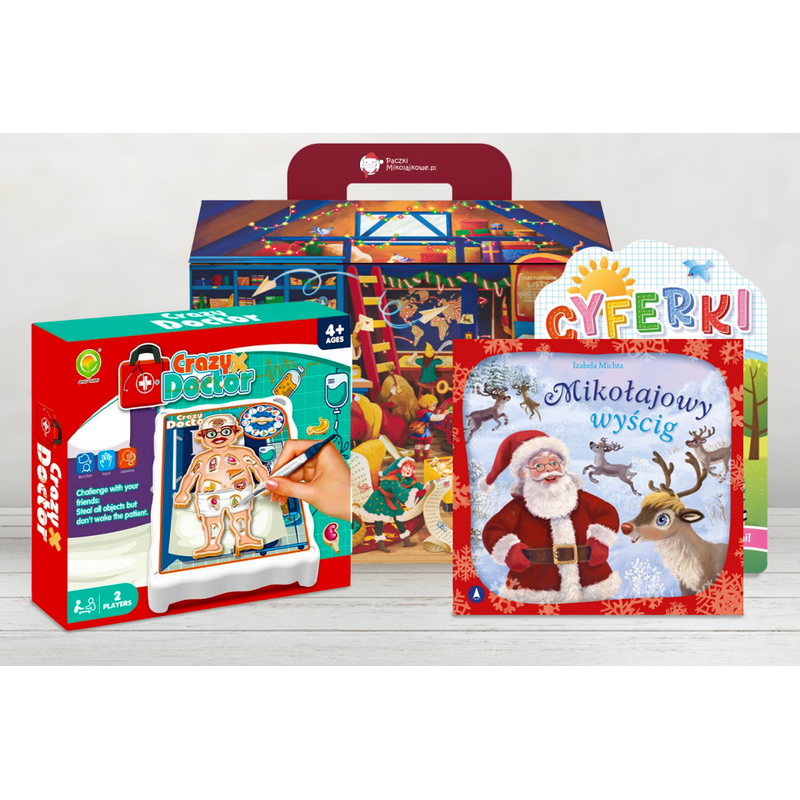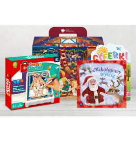 W paczce znajduje się gra zręcznościowa, która pomaga w ćwiczeniu sprawności manualnej i precyzji ruchów. Zestaw uzupełnia porywająca bajeczka świąteczna, wprowadzająca w magiczny klimat i rozbudzająca dziecięcą wyobraźnię, a także ćwiczenia z naklejkami, budujące podstawy do nauki pisania literek i cyferek oraz wspierające koncentrację.
