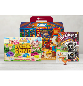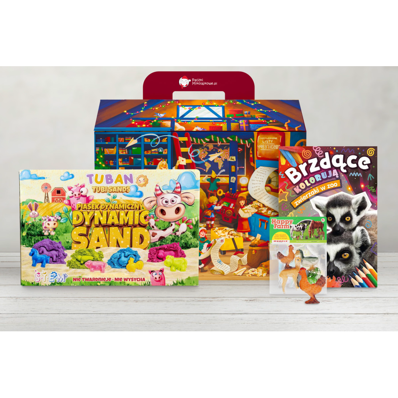 W paczce znajduje się zestaw do piasku dynamicznego, który wspiera rozwój kreatywności dziecka, zachęca do aktywnej zabawy i pozwala na eksperymentowanie z kolorami oraz formą. Paczka zawiera także zestaw figurek zwierząt gospodarskich, rozwijający wyobraźnię i pomagający w tworzeniu własnych historii. Całość uzupełnia kolorowanka z naklejkami, angażująca maluszka w kreatywne działanie i rozwijająca sprawność manualną.