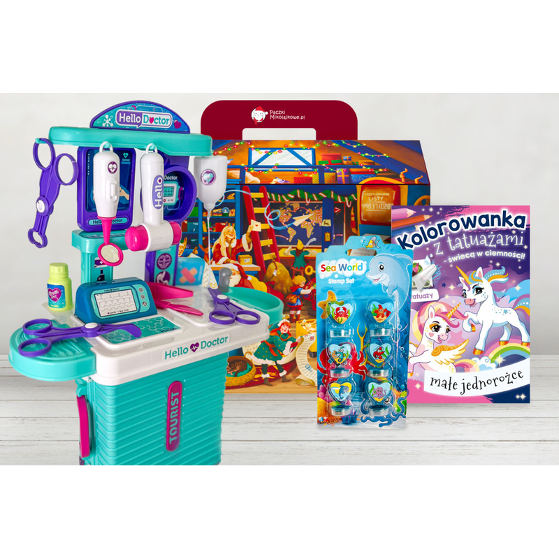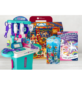 W paczce z zabawkami znajduje się zestaw lekarski w walizce, który pobudza wyobraźnię, wspiera zabawę w odgrywanie ról oraz uczy empatii i troski o innych. Oprócz tego dodano zestaw pieczątek, rozwijających zdolności manualne dziecka, a także kolorowanki z tatuażami, które zachęcają do twórczej zabawy i wspierają rozwój kreatywności.
