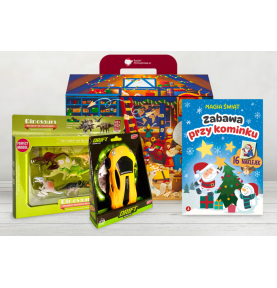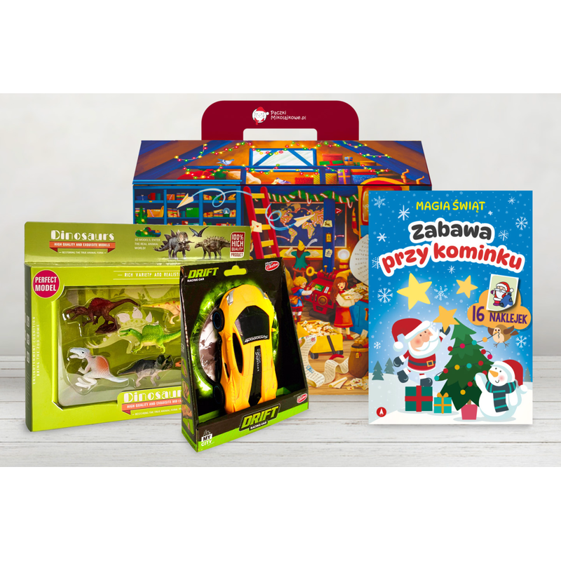 Paczka z zabawkami składa się z zestawu figurek dinozaurów, które pobudzają wyobraźnię i zachęcają do tworzenia własnych historii, auta wyścigowego drift, rozwijającego zręczność manualną i dostarczającego mnóstwo radości podczas zabawy, a także świątecznych ćwiczeń z naklejkami, wspierających rozwój dziecka i dających satysfakcję z wykonywanych zadań.