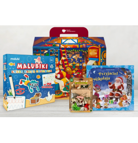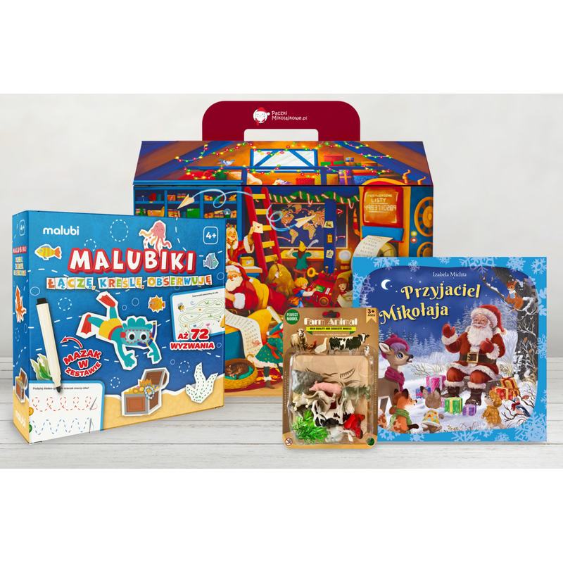 W paczce znajduje się zestaw edukacyjny składający się z łamigłówek rozwijających spostrzegawczość, logiczne myślenie oraz umiejętność skupienia uwagi. W paczce znajdują się również figurki zwierzątek domowych, które pobudzają wyobraźnię i zachęcają do tworzenia własnych historii, a także bajeczka świąteczna, umilająca czas z rodzicami i budująca nawyk wspólnego czytania.