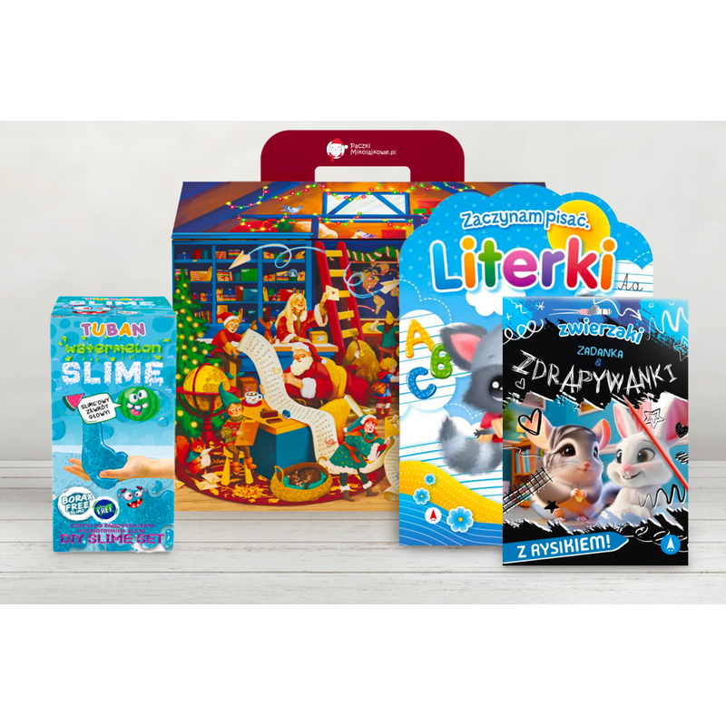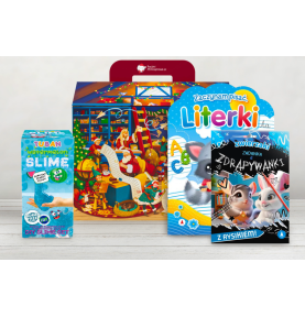 W paczce znajduje się zestaw do przygotowania slime'a, który zapewni świetną zabawę i pozwoli dziecku na kreatywne eksperymentowanie, książeczka ze zgadywankami rozwijająca spostrzegawczość i logiczne myślenie, a także ćwiczenia z naklejkami wspierająca naukę pisania literek.