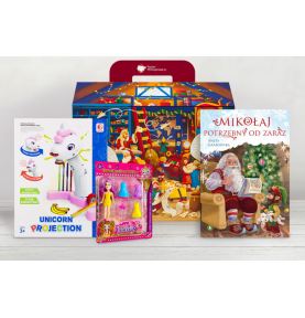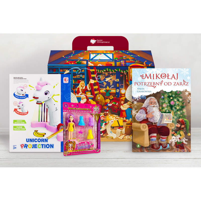 Paczka składa się z projektora ułatwiającego rysowanie, który rozwija kreatywność, fantazję i precyzję ruchów, laleczki z zestawem wymiennych ubrań zachęcającej do zabawy oraz uroczej świątecznej bajeczki przenoszącej dziecko w magiczny świat przygód.