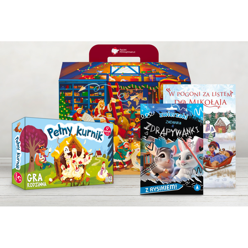 Paczka zawiera grę planszową, uczącą logicznego myślenia, przewidywania konsekwencji i radzenia sobie w trudnych sytuacjach. W paczce znajduje się również świąteczna bajeczka pobudzająca wyobraźnię i rozwijająca fantazję dziecka oraz książeczka ze zgadywankami, która wspiera kreatywność i zachęca do twórczego działania.