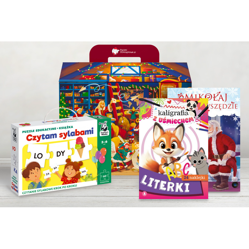 Paczka składa się z puzzli wspierających pierwsze kroki w nauce czytania i rozwijające koncentrację, uroczej bajeczki pobudzającej fantazję i ciekawość świata oraz wprowadzającej w świąteczny nastrój, a także ćwiczenia z zadaniami grafomotorycznymi, które pomagają kształtować estetyczne pismo i przygotowują dziecko do nauki.