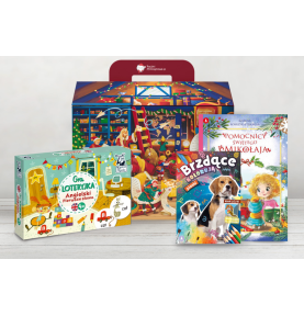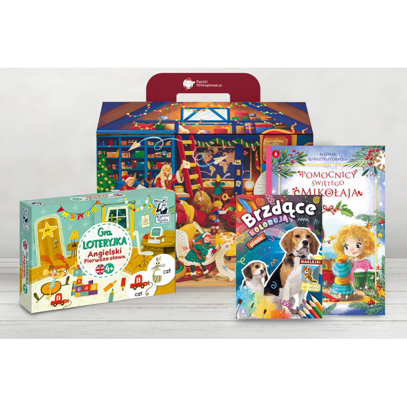 Paczka składa się z gry edukacyjnej wspierającej pierwsze kroki w nauce języka angielskiego, świątecznej bajeczki umilającej wspólny czas z rodzicami i budującej nawyk czytania oraz kolorowanek z naklejkami świecącymi, które zachęcają do kreatywnej zabawy.