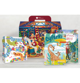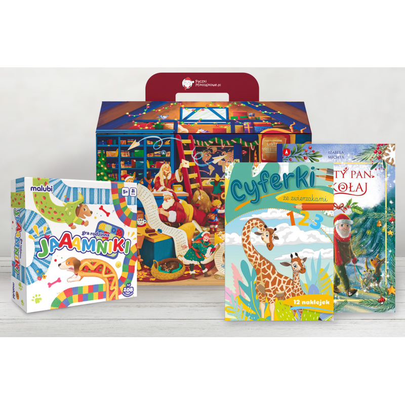 Paczka składa się z edukacyjnej gry logicznej rozwijającej umiejętność logicznego i strategicznego myślenia, bajeczki pobudzającej wyobraźnię i wprowadzającej w świąteczny nastrój oraz ćwiczenia z naklejkami, które wspierają naukę liczenia i rozpoznawania cyferek.