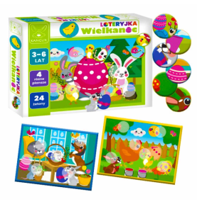 Jedna z pierwszych gier proponowana dla małych dzieci w wieku od 3 lat. Wielkanoc to wspaniały rodzinny czas i piękne ilustracje w grze. Gra zawiera cztery kolorowe ilustracje oraz przygotowane specjalnie do nich 24 żetony. Maluchy układają i odkrywają świat. Dziecko odszukuje odpowiednie miejsce dla żetonu. Układa i widzi całą ilustrację.