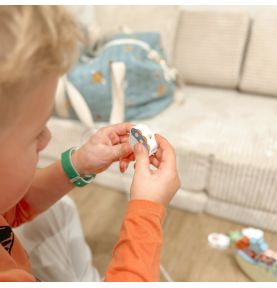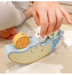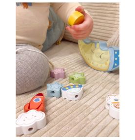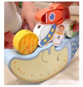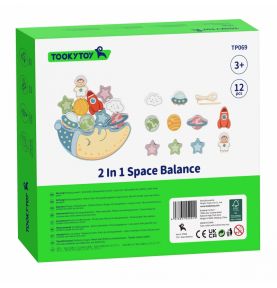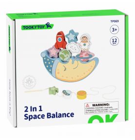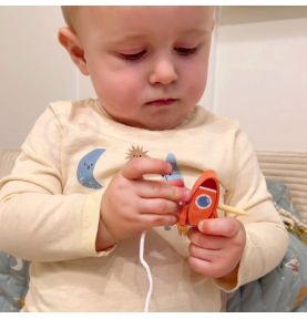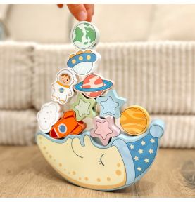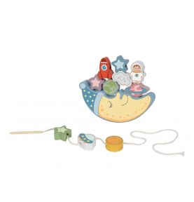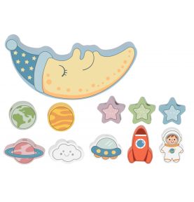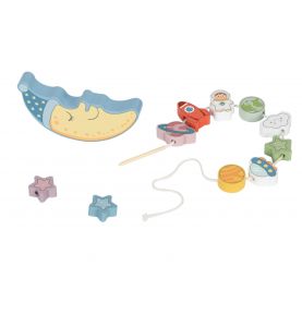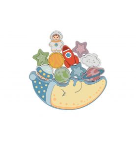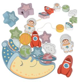 Pierwsza część zabawy to wyzwanie w balansowaniu: dzieci próbują ustawić 10 kolorowych klocków - rakietę, astronautę, gwiazdy, UFO i planety - na śpiącej twarzy księżyca, starając się, by konstrukcja nie przewróciła się. Druga część to kreatywna zabawa w sznurowanie: wszystkie kosmiczne klocki można nawlekać za pomocą drewnianej igły i sznurka, tworząc własne, gwiezdne girlandy!