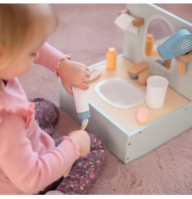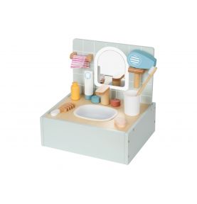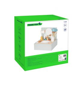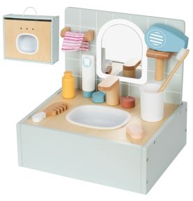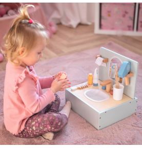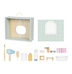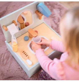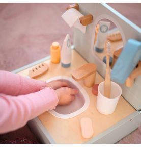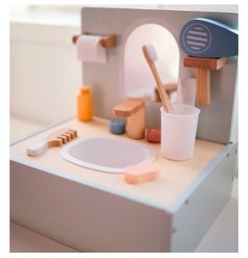 Zestaw to świetny sposób na rozwijanie kreatywności oraz naukę codziennych nawyków, będąc jednocześnie wyjątkowym uzupełnieniem dziecięcej zabawy. Akcesoria można wygodnie przechowywać w drewnianej podstawie, a dzięki poręcznemu uchwytowi, całą "łazienkę" można przenosić w dowolne miejsce!