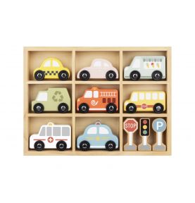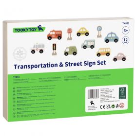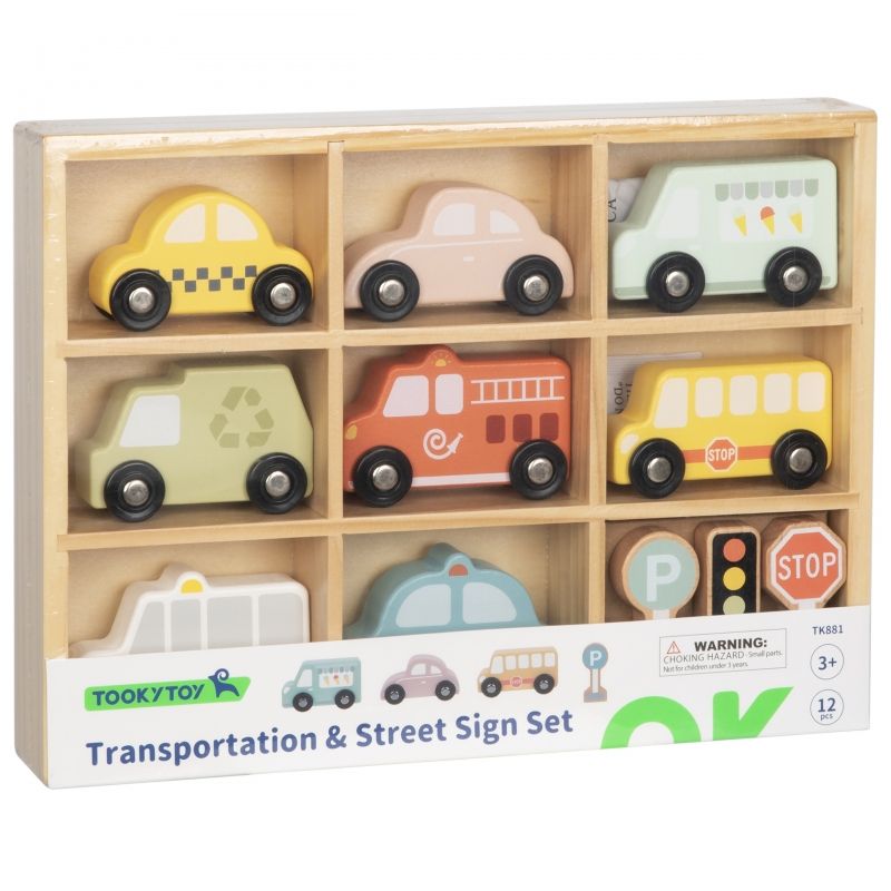 TOOKY TOY Zestaw Drewnianych Pojazdów i Znaków Drogowych w Pudełku