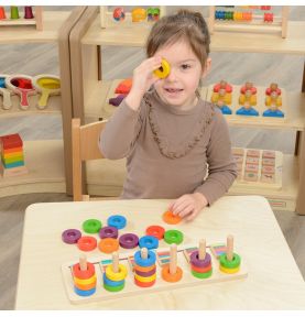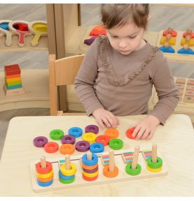 Gotowi na mistrzowski trening sekwencji?! 🎨 Drewniana Układanka Sekwencyjna to absolutna petarda edukacyjna dla maluchów! Ten zestaw to genialny sorter, który przenosi naukę kolorów i liczenia na totalnie nowy poziom! Zestaw składa się z 30 kolorowych pierścieni (6 zestawów po 5 odcieni!) i drewnianej podstawy. Zadaniem dziecka jest układanie ich w odpowiedniej kolejności, co jest rewelacyjnym treningiem logicznego myślenia, koordynacji i małej motoryki już od 2 roku życia!