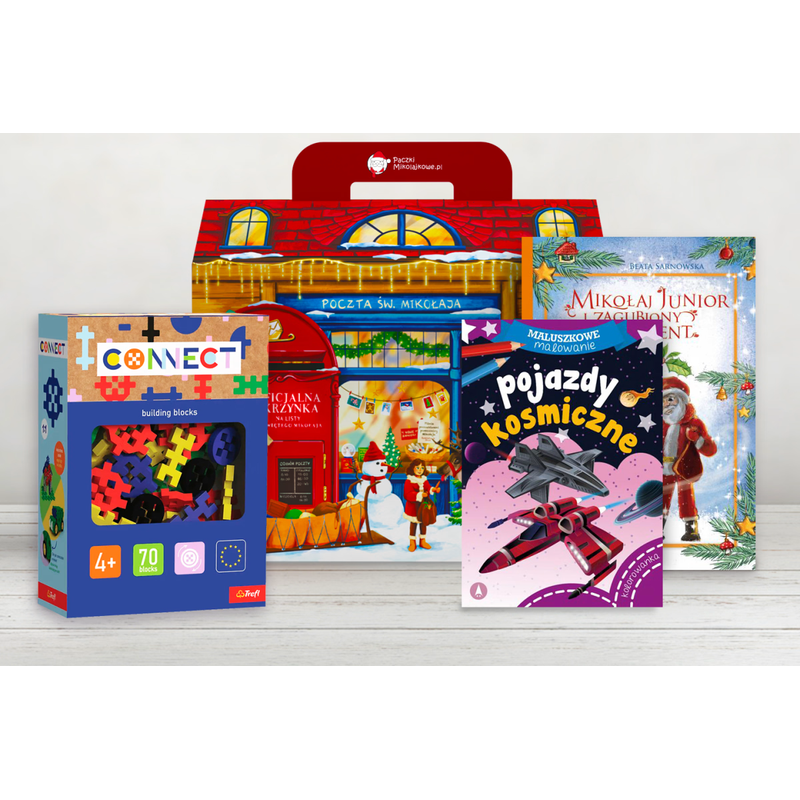 Paczka zawiera zestaw klocków rozwijający wyobraźnię i kreatywność, kolorowankę, bajeczkę świąteczną oraz kuferek, które wspierają zdolności manualne, cierpliwość i twórczą zabawę.