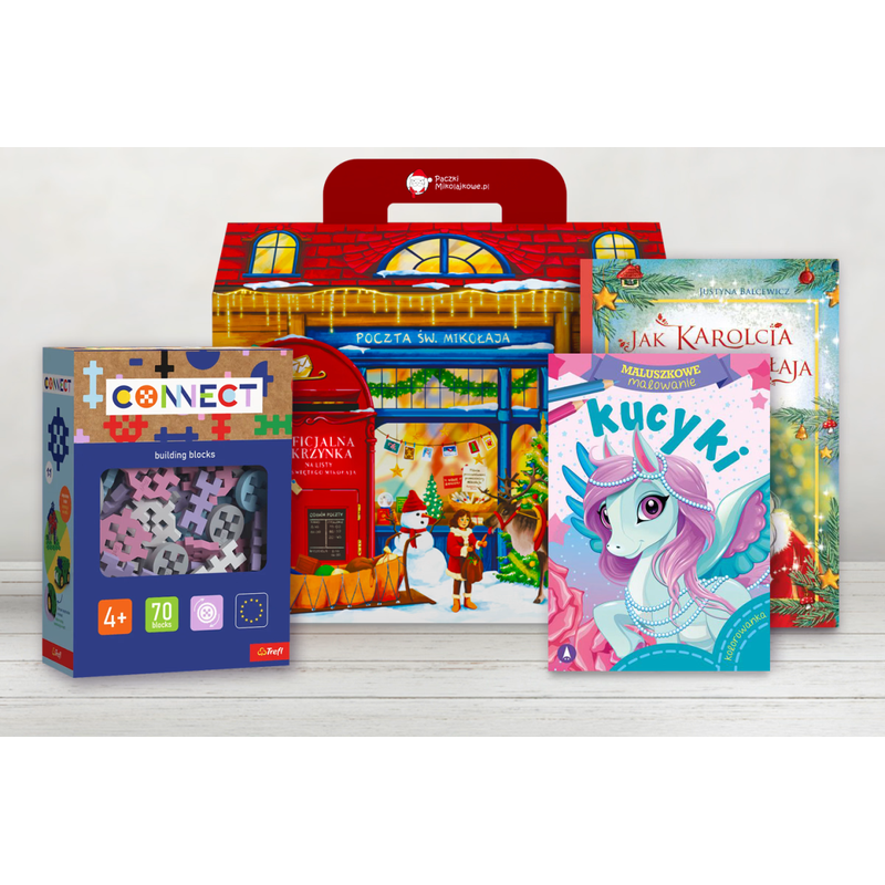 Paczka zawiera zestaw klocków rozwijający wyobraźnię i kreatywność, kolorowankę, bajeczkę świąteczną oraz kuferek, które wspierają zdolności manualne, cierpliwość i twórczą zabawę.