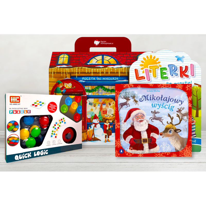 Paczka zawiera grę logiczną zapewniającą świetną zabawę, uczącą sprytu oraz wspierającą refleks i myślenie analityczne, a także porywającą bajeczkę świąteczną wciągającą dziecko w świat przygód i rozwijającą wyobraźnię. Dołączone ćwiczenia z naklejkami wspomagają naukę literek w atrakcyjnej formie zabawy.