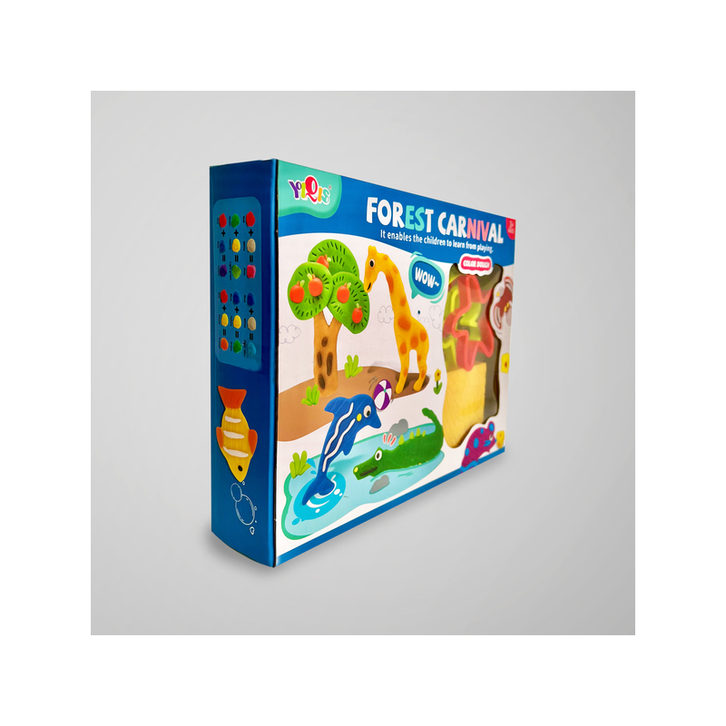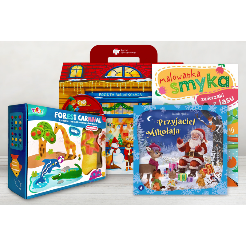 Paczka składa się z zestawu ciastolin i foremek pozwalających na twórcze eksperymentowanie z kolorami i formą oraz świątecznej bajeczki umilającej wspólne chwile z rodzicami i rozwijającej wyobraźnię maluszka. Dołączona malowanka edukacyjna ze zwierzątkami leśnymi inspiruje do nowych pomysłów, ćwiczy precyzję ruchów i wspiera kreatywność.