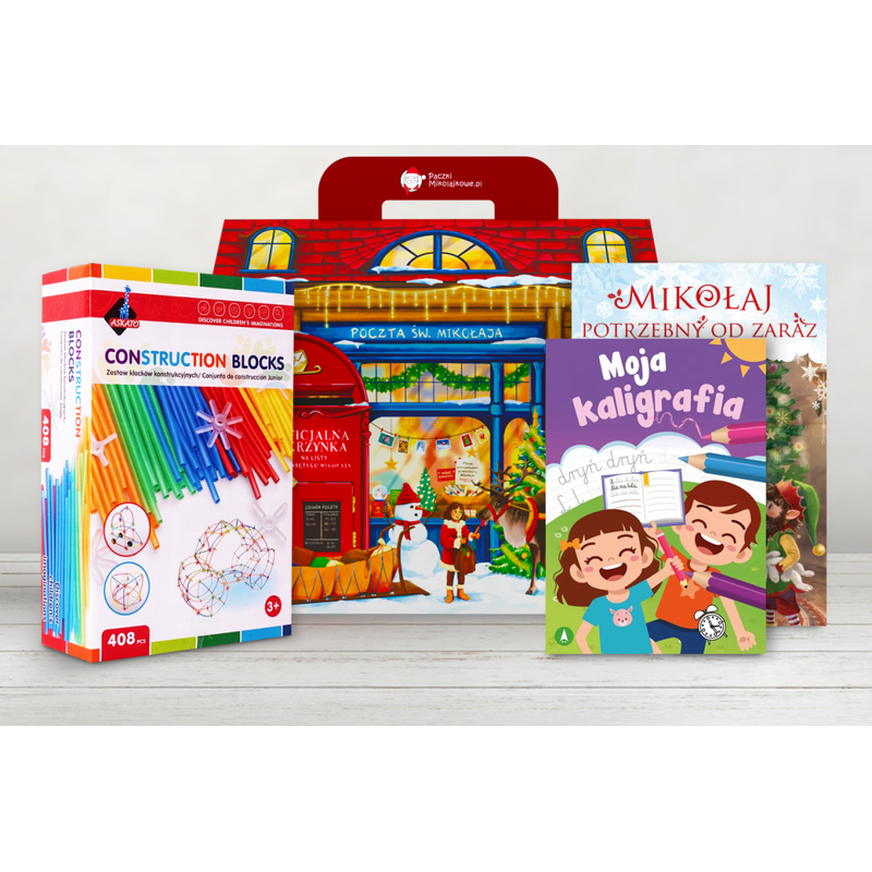 Paczka zawiera zestaw klocków konstrukcyjnych rozwijających kreatywność i koordynację ręka–oko, świąteczną bajeczkę umilającą wspólne chwile z rodzicami oraz ćwiczenia wspierające naukę pisania pojedynczych liter, sylab i prostych wyrazów.