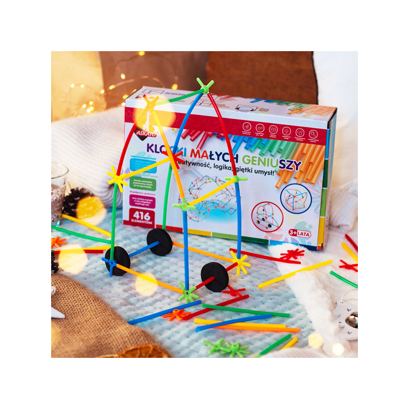 Klocki w formie cienkich, kolorowych słomek, które można łączyć ze sobą za pomocą krzyżaków, tworząc trójwymiarowe konstrukcje. Zestaw rozwija kreatywność, wyobraźnię przestrzenną oraz motorykę małą, pozwalając dzieciom na tworzenie dowolnych form – od prostych modeli po bardziej zaawansowane struktury. Idealny produkt do paczek mikołajkowych dla chłopców i dziewczynek w wieku przedszkolnym.