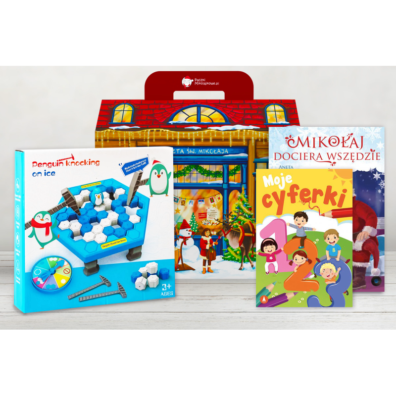 W paczce znajduje się gra zręcznościowa wspomagająca sprawność manualną, refleks i szybką reakcję, świąteczna bajeczka rozwijająca wyobraźnię dziecka oraz ćwiczenia wspierające naukę cyferek i koncentrację.