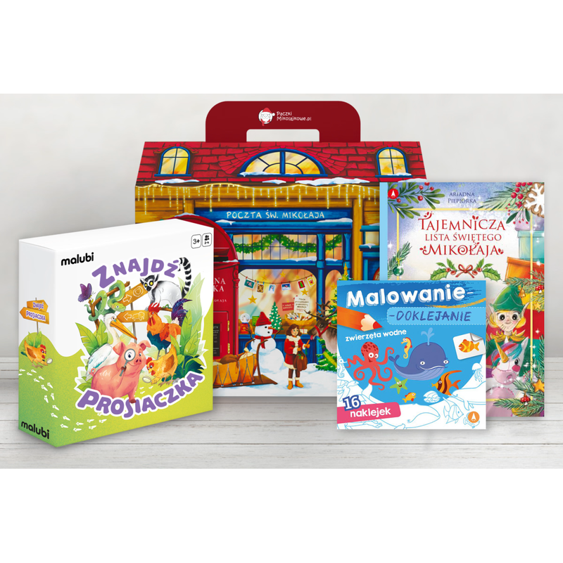 Paczka składa się z gry edukacyjnej wspierającej rozwój spostrzegawczości i umiejętności klasyfikowania, świątecznej książeczki zachęcającej do wspólnego czytania oraz kreatywnej książeczki zadaniowej, która rozwija wyobraźnię, ćwiczy precyzję i inspiruje do aktywnej zabawy.