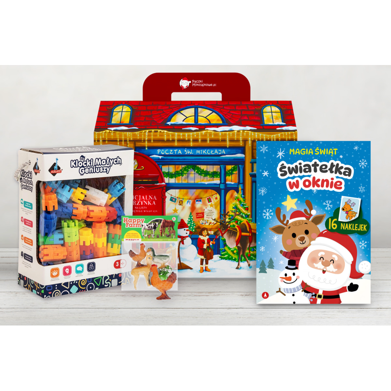 Paczka składa się z zestawu klocków konstrukcyjnych–korony, które gwarantują świetną zabawę, a jednocześnie rozwijają wyobraźnię i wspierają ćwiczenie koordynacji ręka–oko. W zestawie znajdują się także figurki zwierząt domowych, pomagające rozwijać wyobraźnię i umiejętności narracyjne dziecka. Całość uzupełniają świąteczne ćwiczenia z naklejkami, wspierające koncentrację i dalszy rozwój.