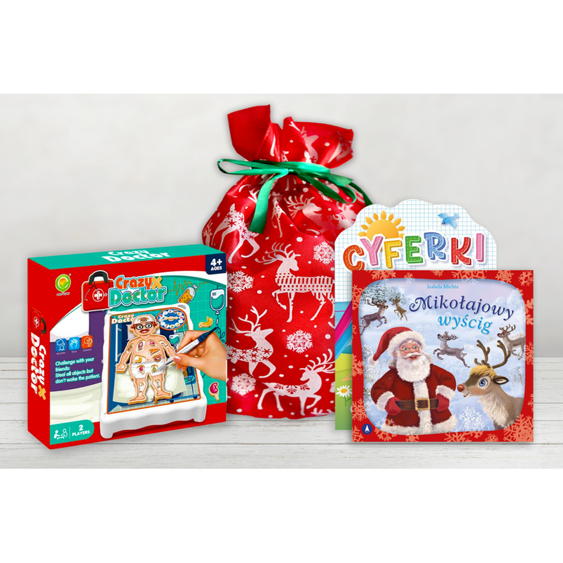W paczce z zabawkami znajduje się gra zręcznościowa rozwijająca sprawność manualną i precyzję ruchów, świąteczna bajeczka pobudzająca wyobraźnię dziecka oraz ćwiczeniówka z naklejkami wspierająca naukę pisania literek i cyferek oraz koncentrację.
