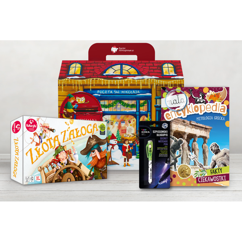 Paczka zawiera grę planszową, która wspiera rozwój logicznego i strategicznego myślenia oraz uczy podejmowania decyzji. W zestawie znajduje się także długopis szpiegowski, zachęcający do eksperymentowania i odkrywania oraz dający dziecku poczucie wyjątkowości. Całość uzupełnia książeczka edukacyjna pełna faktów i ciekawostek o mitologii greckiej, rozwijająca zainteresowania i poszerzająca wiedzę w przystępny sposób.